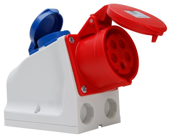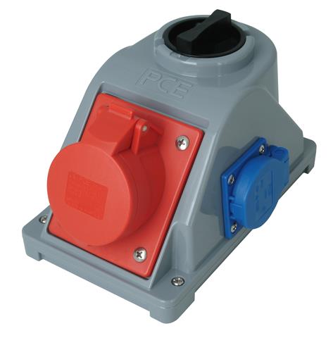 CEE-Kombi-Wandsteckdose: CEE-Steckdose mit Klappdeckel (5p, 16A, 400V, 6h)/Schutzkontakt-Steckdosemit Klappdeckel und mit Schalter (16A, 250V)