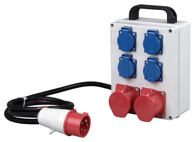 CEE-Mobilverteiler: Eingang: CEE-Stecker (5p, 16A,400V, 6h), Ausgang: 2x CEE-Steckdosen 4x Schutzko ntakt-Steckdosen