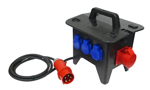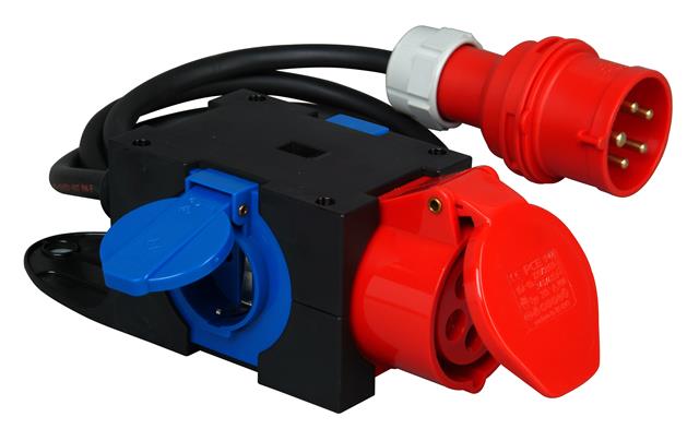 CEE-Kompaktverteiler: Eingang: CEE-Stecker (5p, 16A, 400V, 6h), Ausgang: 1x CEE-Steckdose 2x Schutzkontakt-Steckdosen