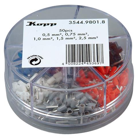 Ader-Endhülsen Sortimentsbox 0,5 - 2,5mm² mit Kunststoffkragen, Inhalt: je 50 Stück 0,5mm², 0,75mm²,1mm², 1,5mm² und 2,5mm²