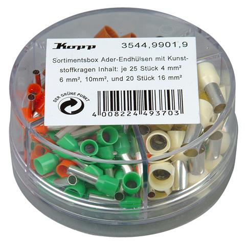 Ader-Endhülsen Sortimentsbox 4 - 16mm² mit Kunststoffkragen, Inhalt: je 25 Stück 4mm², 6mm², 10mm² und 20 Stück 16mm²
